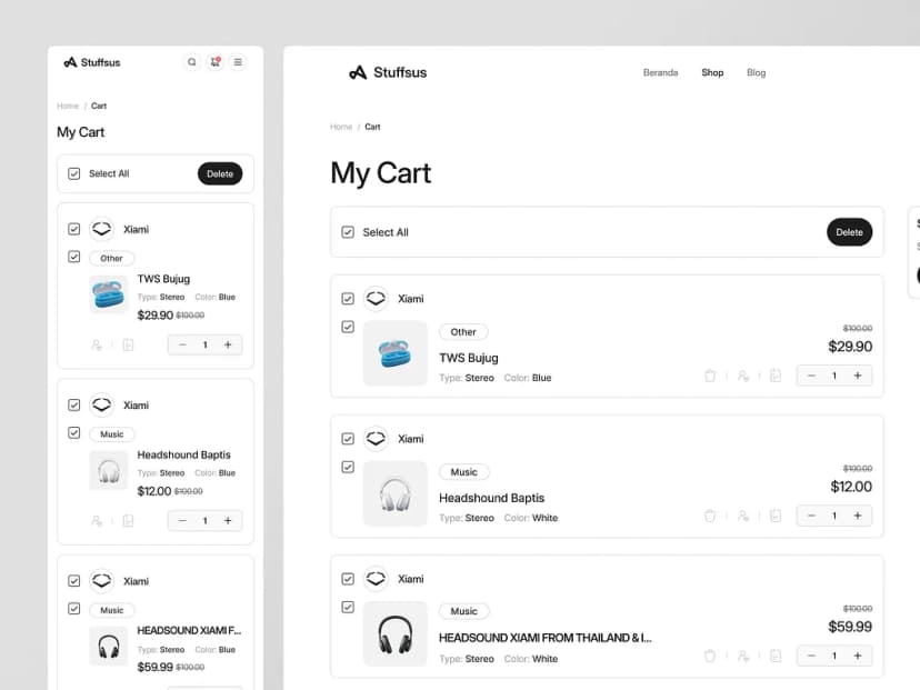 Comprehensive e-commerce templates including product listings, detail views, carts, checkout, and order summaries for smooth shopping experiences.